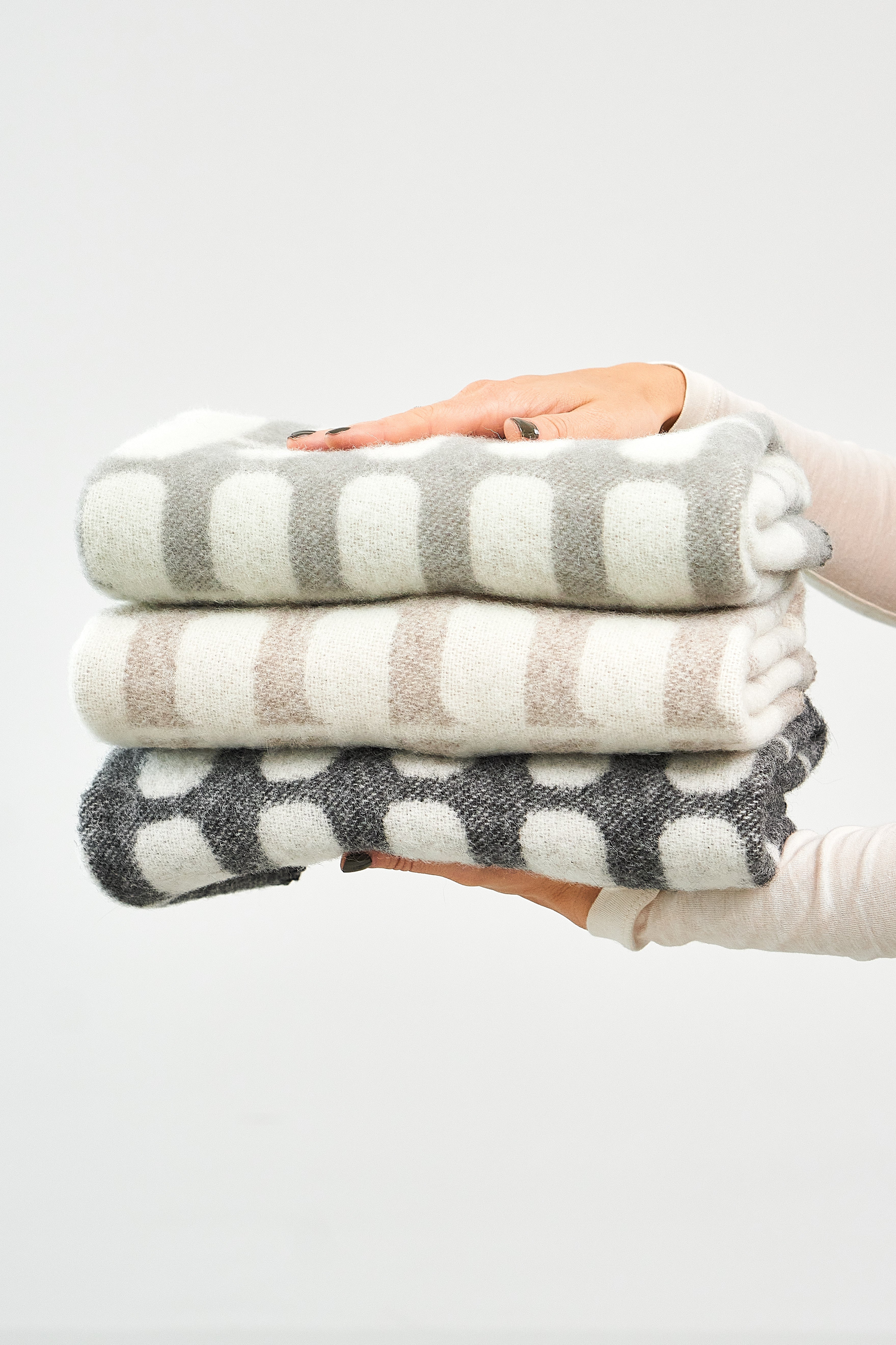 Smaller spots can be gently brushed out or dabbed with a damp cloth. For a deeper clean, Flora can be washed on a gentle wool cycle at 30 °C or professionally dry-cleaned. After washing, lay the blanket flat on a rack to air dry.