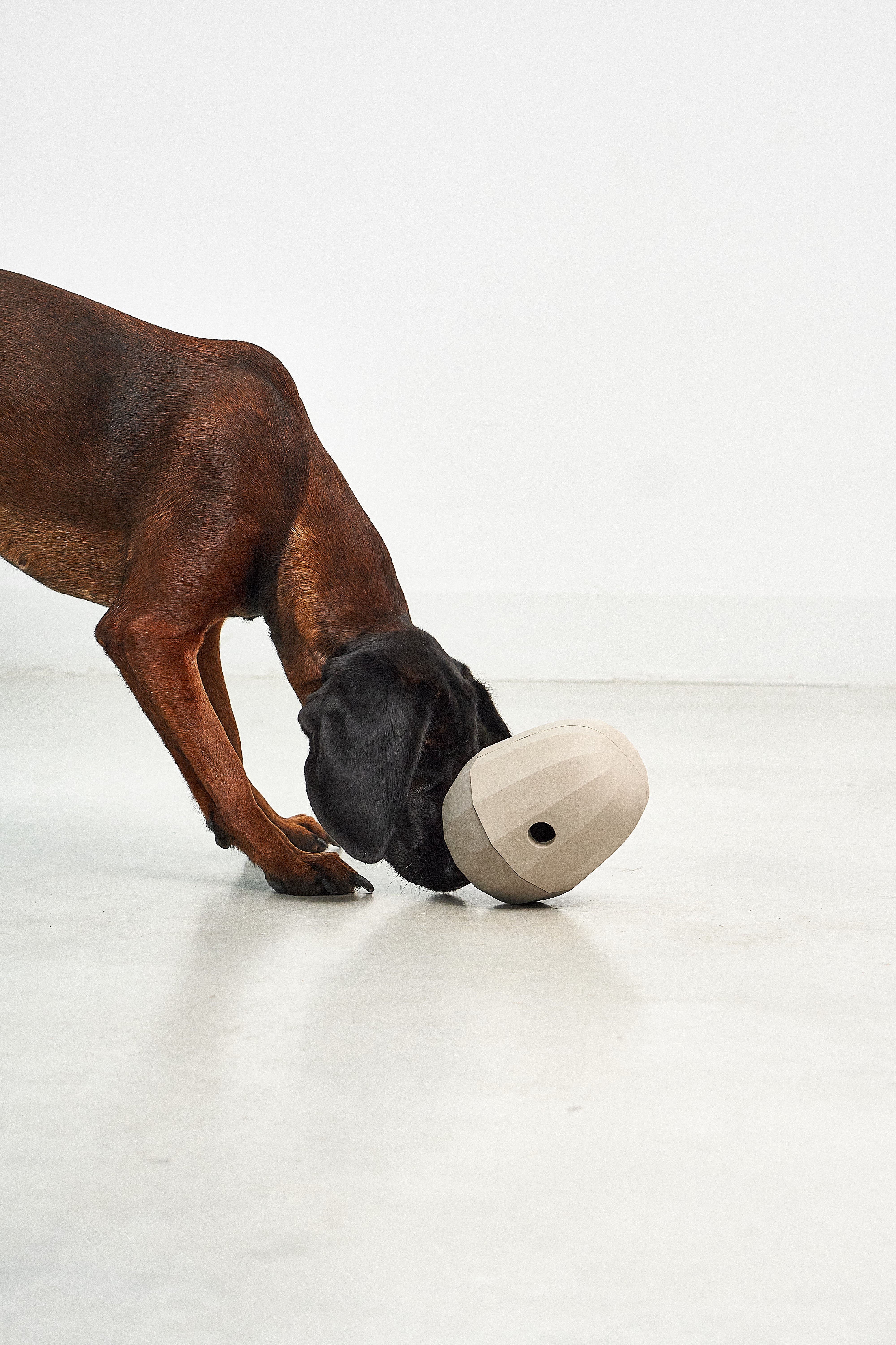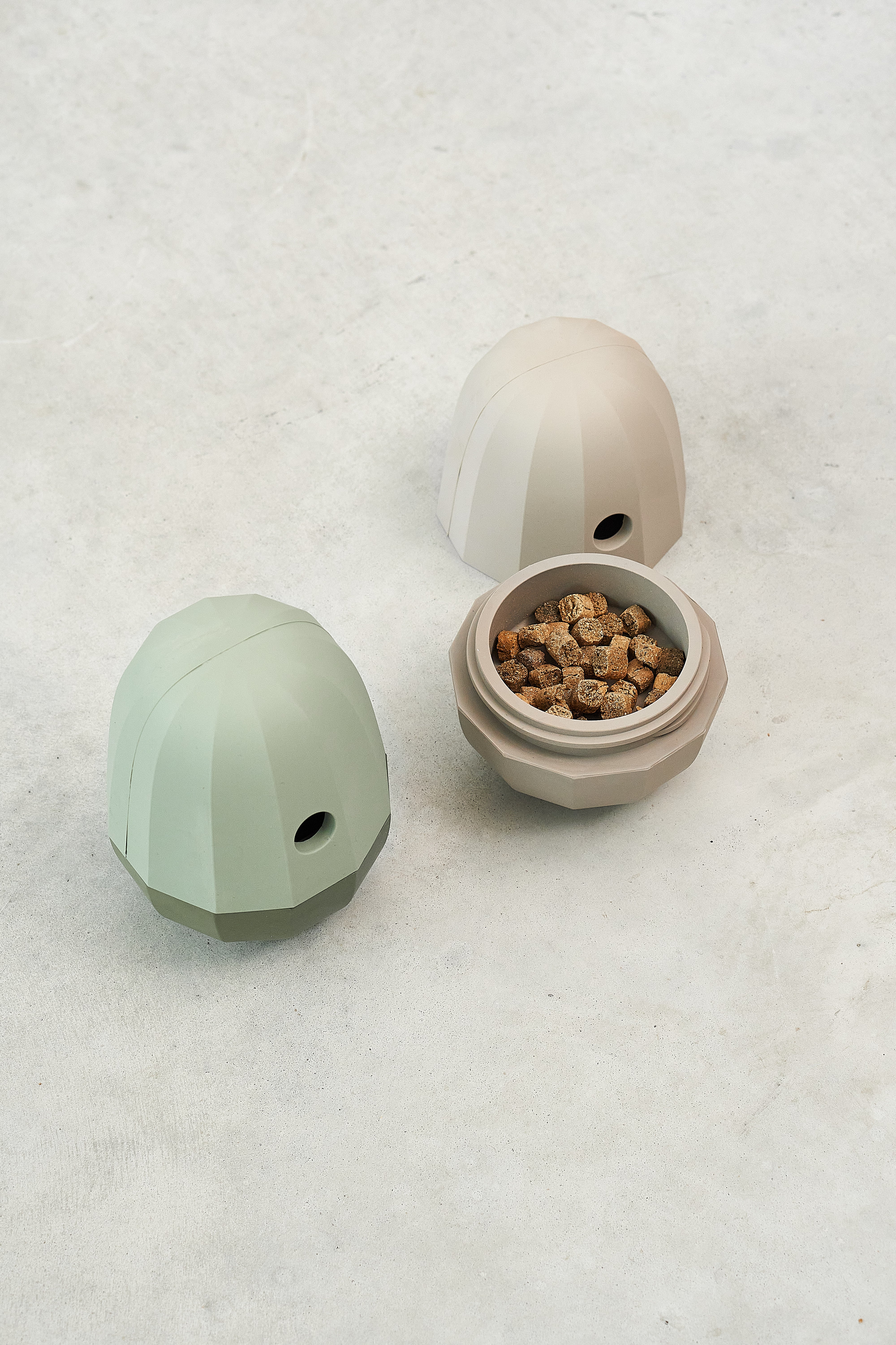 "We imagined Uovo as an engaging way to stimulate dogs during playtime. Its overall shape resembles an egg—“uovo”—which makes it perfect for functioning as a wobbler: a weight in the lower section allows it to rock back and forth and always return upright. When filled with food, the opening at the top lets treats gradually fall out as the dog interacts with it. We designed the surface with a faceted pattern that creates an interesting play of light and shadow, while also altering the toy’s oscillation to make the movement more dynamic and unpredictable."