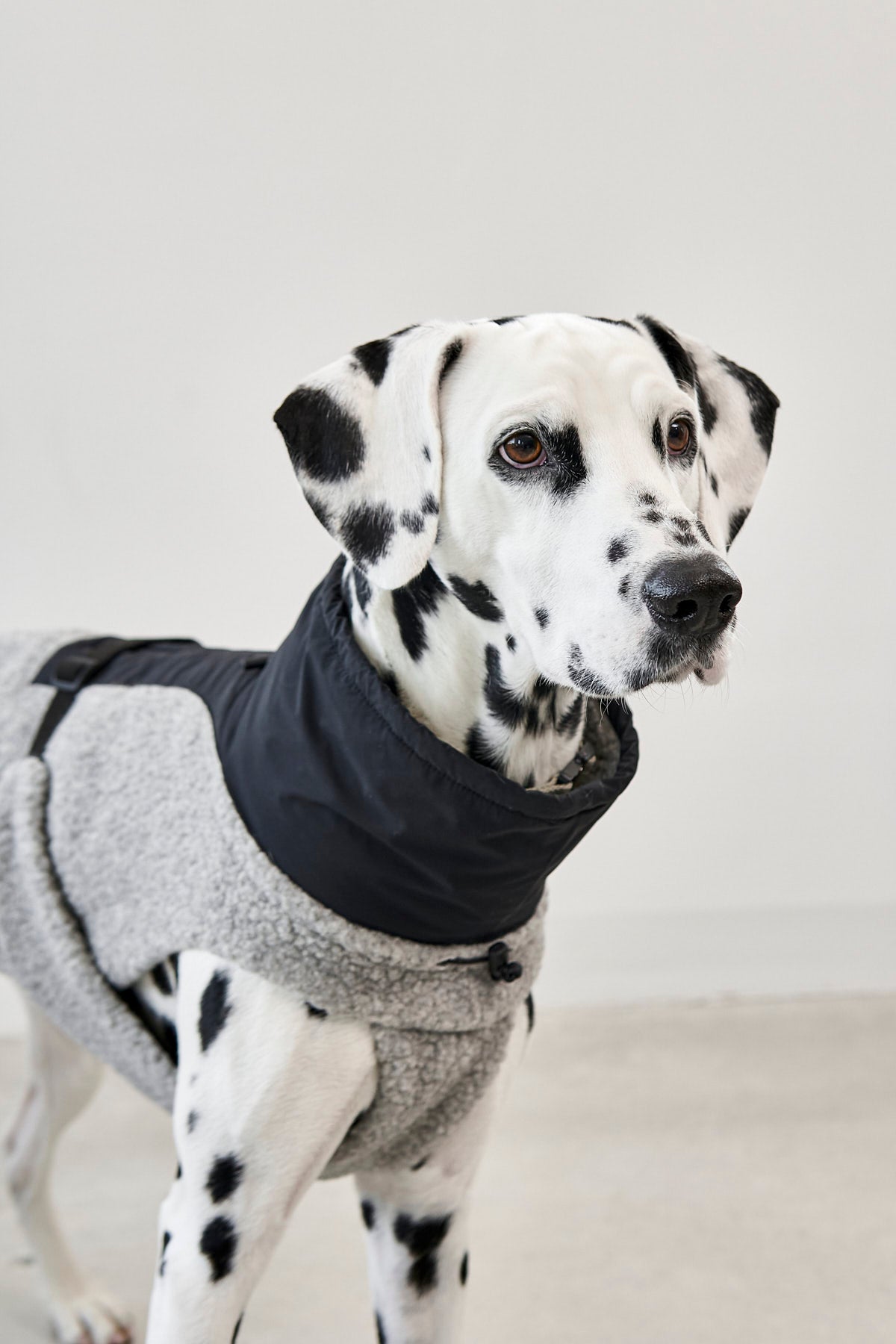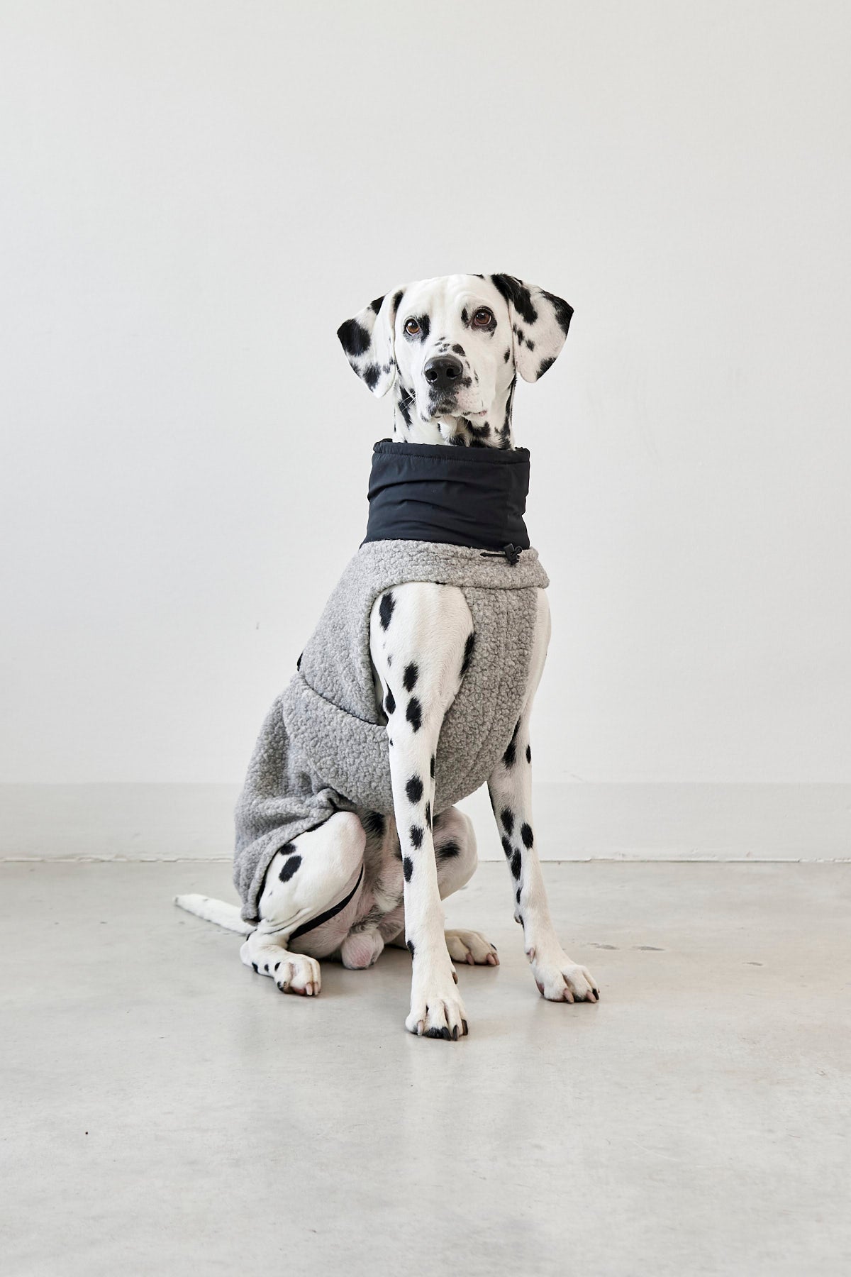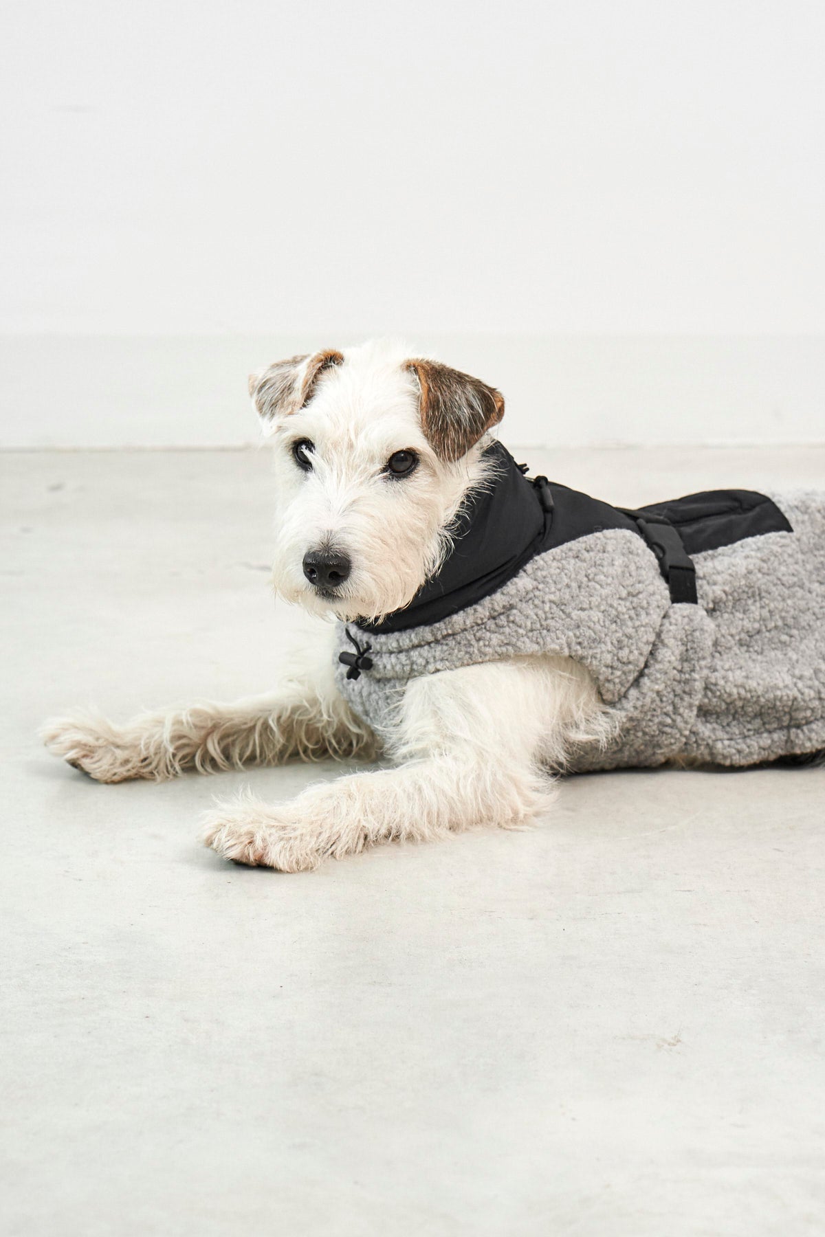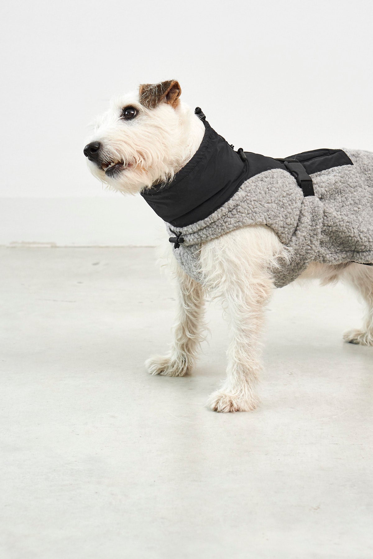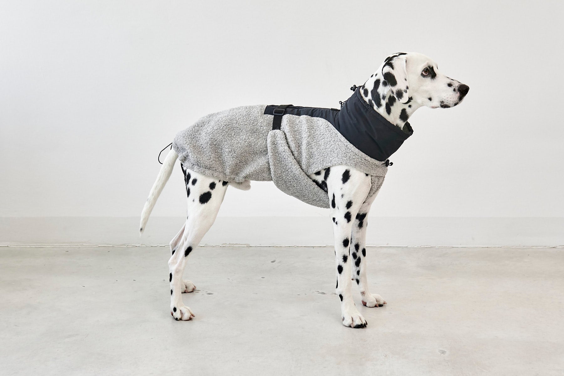 Der Bouclé-Oberstoff mit Wollanteil sorgt für natürliche Wärme und eine angenehm weiche Haptik, während das atmungsaktive Lining für ein ausgeglichenes Klima sorgt. Dank des leicht elastischen Materials und des Beinausschnitts bietet Emilia maximale Bewegungsfreiheit. So kann Dein Hund sich frei bewegen und bleibt gleichzeitig wunderbar geborgen. Der stufenlos verstellbare Bauchgurt fixiert den Bauchlatz individuell, während elastische Beinschlaufen für sicheren Halt bei jeder Bewegung sorgen. Eine perfekte Passform für kleine und große Hunde ermöglichen die regulierbaren Gummizüge mit Kordelstopper am Rutenansatz sowie an Kragen und Hals.